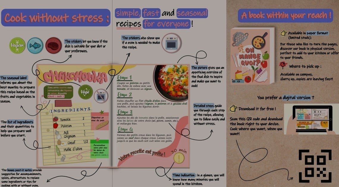 Le projet avait pour but de créer un concept qui se mariait avec une des idées du développement durable. Pour rendre accessible une bonne alimentation, de saison, et adaptés à tous, nous avons imaginé un livre de recette destiné aux étudiants. Nous pouvons retrouver à l'intérieurs des recettes et astuces, adaptable à tout type de régime et d'équipement, qui suit les saisons.